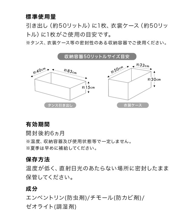 エンペントリン(防虫剤)、チモール(防カビ剤)、ゼオライト(調湿剤)