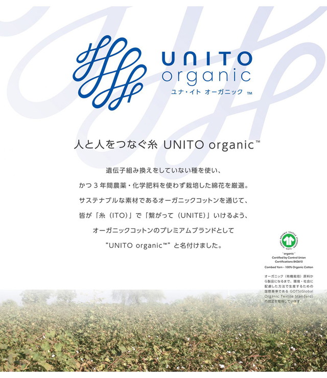 オーガニックコットンを使用しています。オーガニックコットンは遺伝子組み換えでない種を使い3年間農薬・化学肥料を使わず栽培した綿花を手摘みにて収穫された天然繊維です。