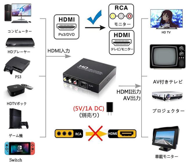 【多機能サポート】HDMI AVコンポジット変換は簡単に変換でき、Blu-Ray、HD-DVD、DVD プレヤー、HDTV ボックス、HD レコーダー、PS3、PS4、Xbox360、などHDMI出力端子がある機器にに使われます。入力端子:HDMI x 1;出力端子:AV x 1; L / R x 1; HDMI x 1【簡単取り扱い】HDMI AV分配器はデジタルであるフルハイビジョンHDMI信号をアナログであるコンポジット/HDMI信号に変換し、映像表示、音声(L/R)出力するコンバーターです。接続するだけで取り扱いも簡単にできる コンポーネント hdmi 変換器です