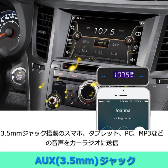 FMトランスミッター ワイヤレス オーディオ ハンズフリー通話 充電式 3.5mm カーステレオ スマホ タブレット MP3プレーヤー iPad iPhone Android 対応 auxオーディオ MP3 音楽 再生