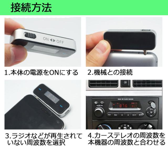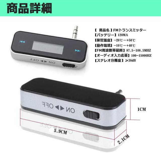 【接続簡単】3.5mmプラグをデバイスに挿入します。送信機の電源を入れ、お住まいの地域で使用されていないFM周波数に設定します。カーラジオをその周波数に設定すると、音楽が再生可能!送信機はスマホからのすべての音声を再生するので、ハンズフリー通話にも使用できます。