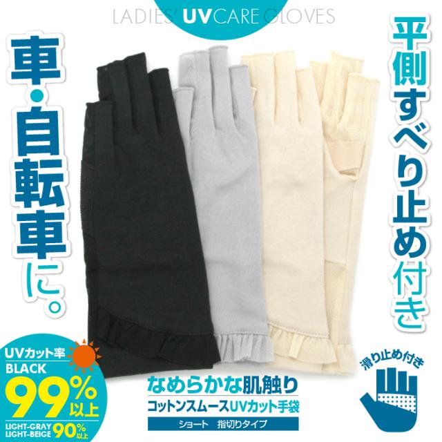 レディース 甲側コットン100%平側メッシュ フリル装飾UVカット手袋 ショート 滑り止め付き 指切りタイプ 全3色