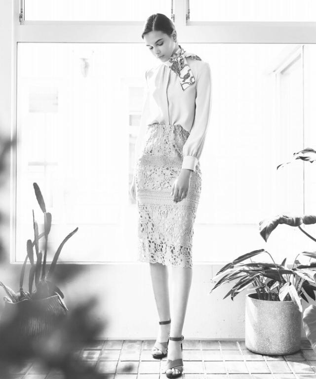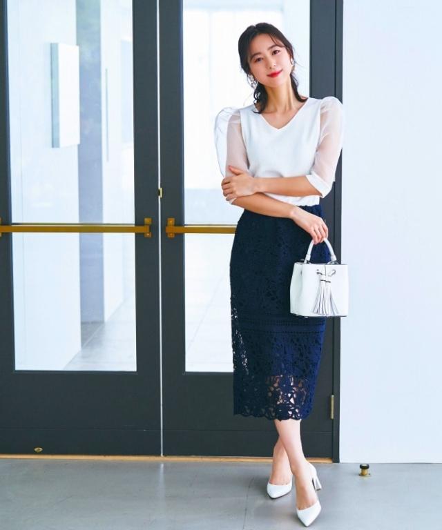 1枚で華やかな着こなしが決まる、切替え総レースのタイトスカート。