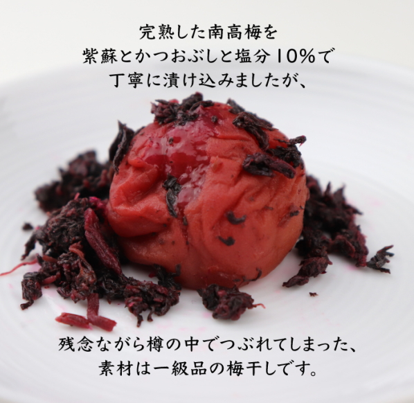 完熟した南高梅をしそとかつお節と塩分10%で漬け込みましたが、残念ながら樽の中でつぶれてしまったり、手作業中に皮がむけてしまった梅干しです。