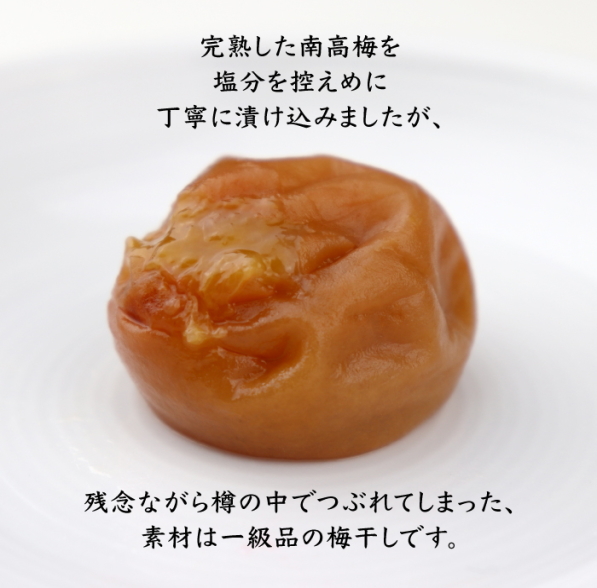 完熟した南高梅を塩分を控えめに漬け込みましたが、残念ながら樽の中でつぶれてしまったり、手作業中に皮がむけてしまった梅干しです。