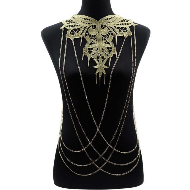 蝶(チョウチョウ)と花をモチーフにした金色の刺繍のレースのレリーフに金色のスパイクコーンが揺れるゴールドチェーンをリンクさせたドレッシーなボディーチェーン。