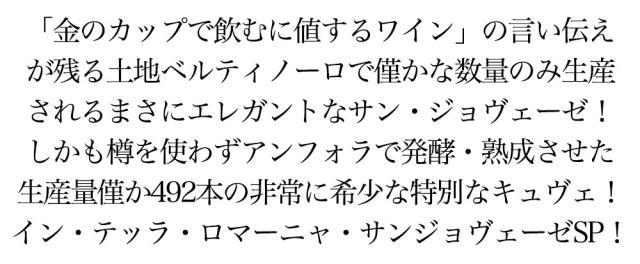 「金のカップで飲むに値するワイン」の言い伝えが残る土地ベルティノーロで僅かな数量のみ生産されるまさにエレガントなサン・ジョヴェーゼ!しかも樽を使わずアンフォラで発酵・熟成させた生産量僅か492本の非常に希少な特別なキュヴェ!イン・テッラ・ロマーニャ・サンジョヴェーゼSP!■さまざまなギフトアイテムをご用意しております。お中元 ギフト 御中元 お盆 お礼 敬老の日 クリスマス 冬ギフト お歳暮 御歳暮 お年賀 御年賀 お正月 年末年始 ご挨拶 バレンタイン ホワイトデー お返し 父の日 母の日 ギフト 贈答品 お土産 手土産 御祝 御礼 内祝い 引き出物 お祝い 結婚祝い 結婚内祝い 出産祝い 出産内祝い 引き菓子 快気祝い 快気内祝い 進学祝い 誕生日祝い バースデーケーキ プレゼント Wedding ウェディング ホームパーティ お花見 パーティ 退職ギフト 退職 就任祝い