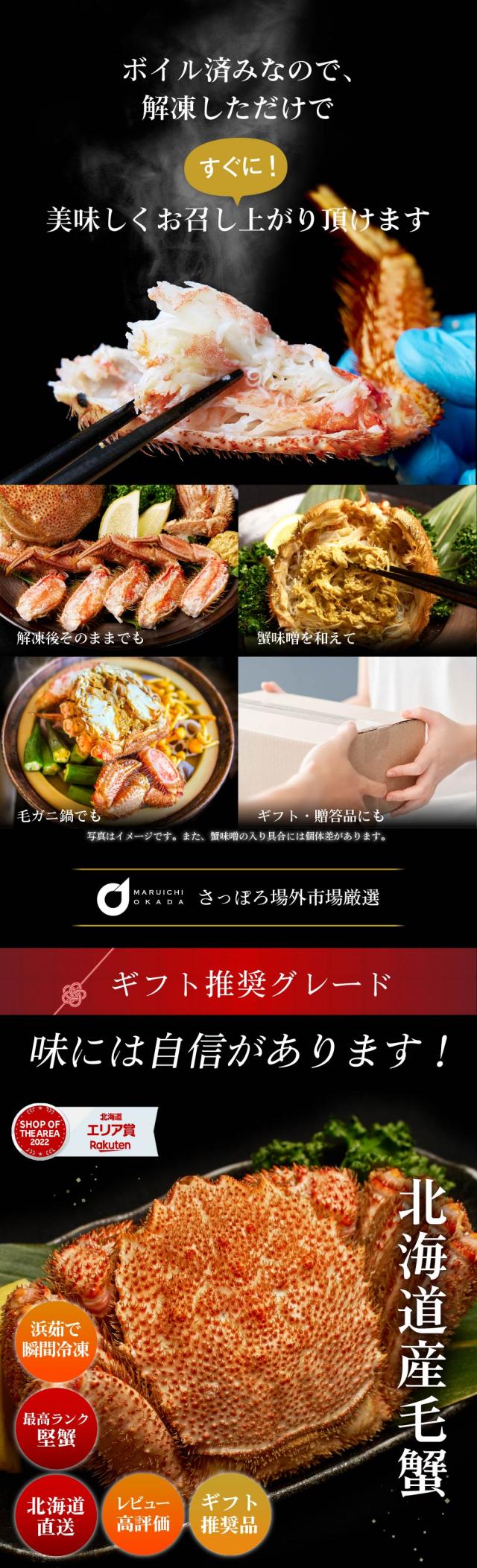 | 商品説明 | 当店の店頭にて年間4,000杯以上を販売する毛蟹! 毎朝仕入れられる毛蟹を厳選してお届け致します。 獲れたての蟹をすぐに茹で上げ、特殊な技術で瞬間冷凍。 抜群の鮮度で、毛蟹本来の味をギュッと閉じ込めていますので、解凍するだけで「プリっ」と美味しい毛蟹をお楽しみ頂けます。 こちらの毛蟹のサイズは「400g」。 お買い求めやすいサイズながらも、中身はギッシリの「堅蟹」です。 北海道でしか味わえない浜茹での毛蟹をご家庭でもお楽しみください。 |