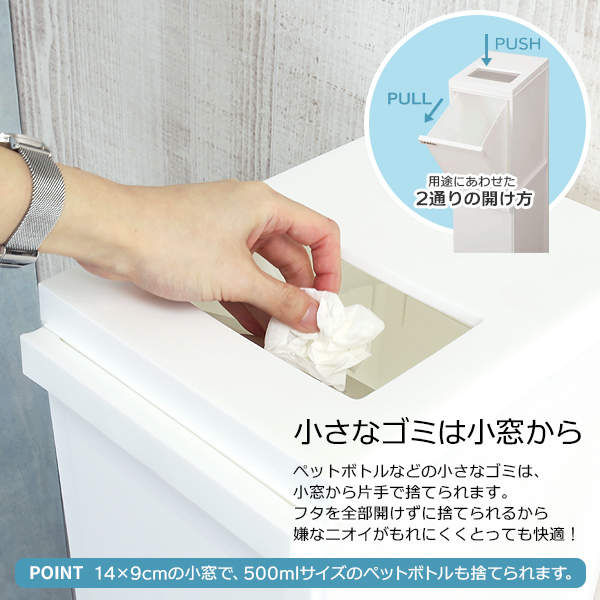小さなゴミは「ワンプッシュ」ペットボトルやティッシュなどの小さなゴミをサッと捨てたいときは上の小窓からワンプッシュ。