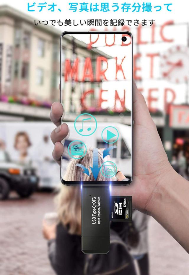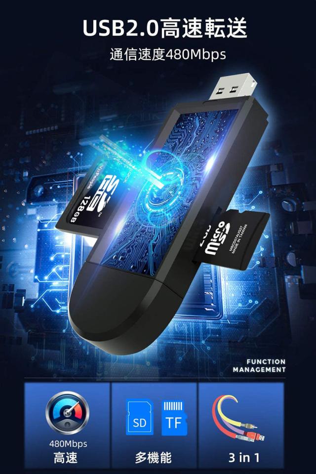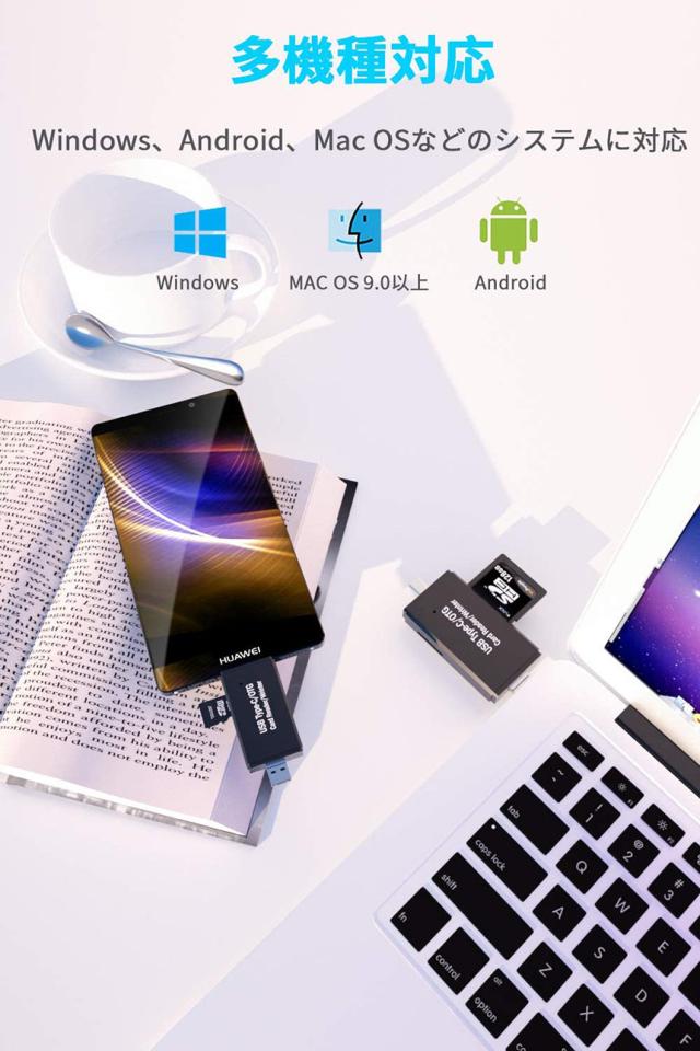 【USB2.0対応の専用カードリーダ】各種USB2.0端子を搭載するデバイスに適用しています。パソコンはもちろん、タブレットやスマホでも使えます。最大伝送速度480Mbpsの高速データ転送体験を実現しています。【3in1カードリーダー】Type-cとMicro USBとUSB2.0の3種類の端子を組み合わせで、PCやOTG機能対応のタブレットやAndroidスマートフォンのデータ転送に最適します。(ご注意:Type-cはsonyには対応していないです。)
