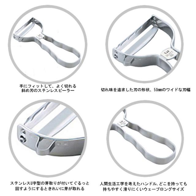 商品説明 | ●「使った人が100%満足できるものにしたい」という思いが込められた「SELECT 100」 「セレクト100 T型ピーラー 000DH3000」 手にフィットしてよく切れる斜めの刃のステンレスピーラーです。 刃が斜めに設定してあるので、切り始めがスムーズ。 U字の芽取はぐるっと回すようにすると、きれいに芽がとれます。 ハンドルは滑りにくいウェーブの一体型で洗いやすく、清潔に保てます。 手にフィットしてよく切れる斜めの刃を採用。 切り始めがスムーズです。U字の芽取はぐるっと回すようにすると、きれいに芽がとれます。 ハンドルは滑りにくいウェーブの一体型で洗いやすく、清潔に保てます。 |
