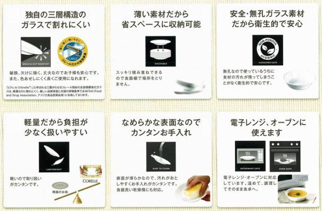商品説明 | 【コレール ウィンターフロストホワイトシリーズ】 どんなシチュエーションにも使え、料理をひきたてるシンプルなホワイト。 【コレールの歴史と機能】 コレールは、40年以上も前に研究開発担当者によって開発された、欠け・破損に耐性がある全面積層強化ガラス製の食器。世界中から支持を集めているコレールシリーズはご家庭の定番になるような長く使える商品。「割れにくい」「欠けにくい」「電子レンジ・オーブン・食洗機に対応」、毎日使う食器としての条件を兼ね揃えている。 【独自の三層構造のガラスで割れにくい】 破損、欠けに強く、丈夫なので、お子さまや、ご年配のかたも使用できる。また、色あせしにくく長く使用できる。「ビトレル(Vitrelle)」と呼ばれる三層からなるコレール独自の全面積層強化ガラスは、計量なのに割れにくく、厳しい品質検査と米国の評価基準であるFDA(Food and Drug Association、アメリカ食品医薬品局)に合格している。 【薄い素材だがら省スペース収納】 薄い素材の軽量タイプなのでスッキリ積み重ねができて食器棚で場所を取らない。 【薄い素材の軽量タイプ】 軽量のおかげで取扱いが簡単で負担が少ない。 お子さまや、ご年配のかたも使用できる。 【なめらかな表面でお手入れ簡単】 表面が滑らかなので、汚れが落としやすくお手入れが簡単。 もちろん食器洗い乾燥にも対応。 【無孔ガラス素材だから衛生的で安心】 無孔なので使っているうちに食材の汚れが残ってしまうことがなく衛生的。長く、衛生的に使用できる。 【電子レンジ、オーブンに使える】 電子レンジはもちろん、オーブンにも対応しているので、温めて調理した料理をそのまま食卓へ。 |
