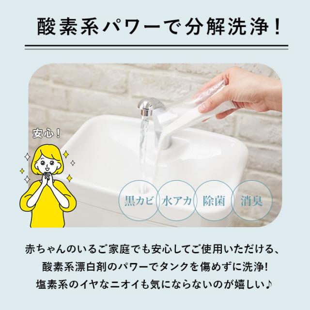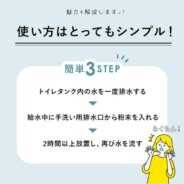 | 使用方法 | 1.一度排水し、タンク上部の手洗い用排水口から給水時に粉末を入れてください。 ※手洗いがない場合はタンクのフタを開けて、タンクの中に粉末を入れてください。 2.2時間以上放置し、水を流してください。しつこい汚れには繰り返すか、2包投入をお勧めします。 ※タンク内部の水面より上の汚れは落ちません。粉末を投入後にブラシなどでこすり洗いをしてください。 ※1〜2週間に一度の洗浄をお勧めします。 |