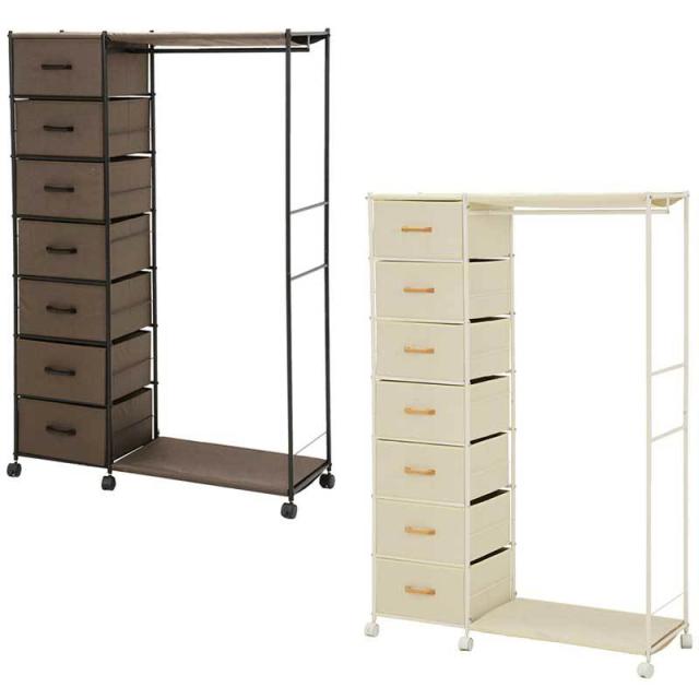 コートなど衣類や帽子、小物類も美しく収納できるハンガーラック。引き出し7杯付きワイドタイプ。