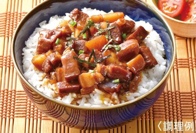 原材料 豚バラ肉、野菜(たけのこ、しいたけ)、しょうゆ、砂糖、みりん、たん白加水分解物、泡盛、おろし生姜、おろしにんにく/増粘剤(加工でん粉、キサンタンガム)、カラメル色素、調味料(アミノ酸等)、(一部に小麦・豚肉・大豆を含む)