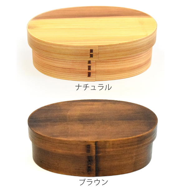 杉材本来の色を貴重としたウレタン塗装を施しているナチュラルと、木目に深みが増す漆塗装を施しているブラウンの2色のカラー展開で、どちらも木のぬくもりを感じる味わいのある色です。使い込むほどに愛着が湧き、ランチタイムが特別な時間になる様なお弁当箱です。