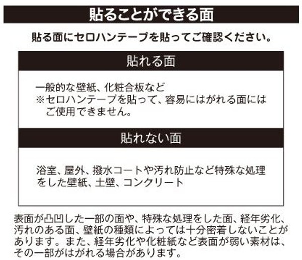 | 備考 | 腰壁タイプ 貼れる面:一般的な壁紙、化粧合板など ※セロテープを貼って、容易にはがれる面にはご使用できません。 貼れない面:浴室、屋外、撥水コートや汚れ防止など特殊な処理をした壁紙、土壁、コンクリート |