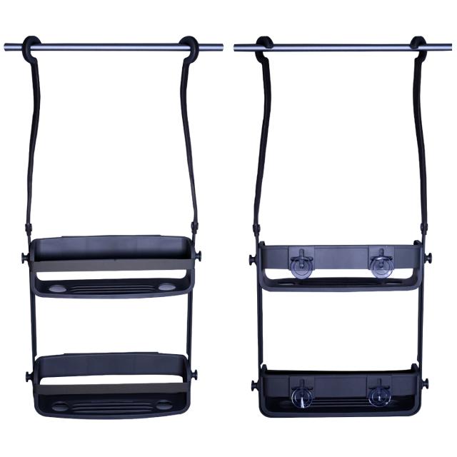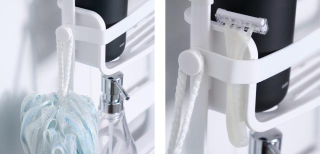 ラックの左右に1つずつ、合計4つのフックが付いています。バスルームで使用するボディウォッシュ、ボディタオルなどを吊るすことができます。本体前面にはバンドがあり物が落ちにくく、サイドのバンド部分にカミソリなどを挟んで収納も可能です。