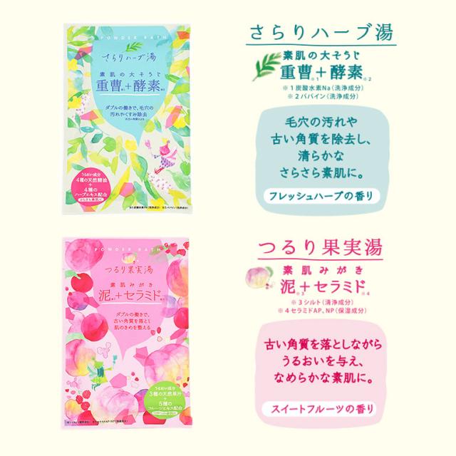 種類:さらりハーブ湯、つるり果実湯、ふわりミルク湯、きりり柑橘湯、しっとり森林湯、爽やかシトラス湯