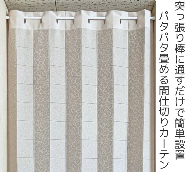 間仕切り カーテン 100×250cm パタッとたためるカーテン 花とストライプ柄 ( 目隠し のれん 暖簾 仕切り つっぱり式 カーテンレール 断熱 洗える 取り付け 簡単 省エネ フリーカット コンパクト 玄関 リビング 窓 小窓 )