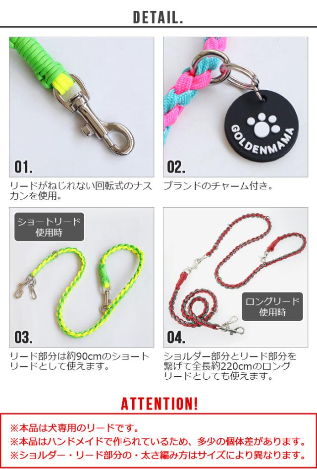 | 本品は犬専用のリードです。 本品はハンドメイドで作られているため、多少の個体差があります。 水で洗った際は金具類についた水を軽く拭き取ってください。 |
