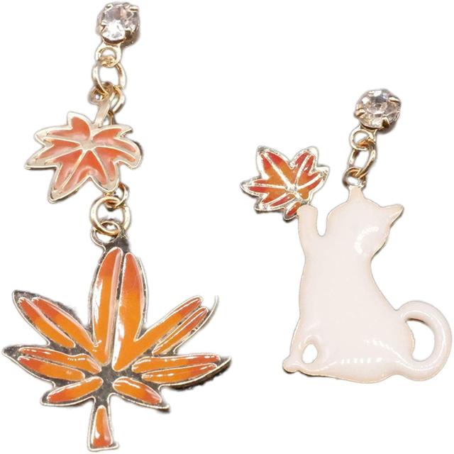 ピアス イヤリング 木の葉ピアス 猫ピアス 猫イヤリング 左右非対称 レディースピアス レディースイヤリング ピアス女性 人気ピアス 人気イヤリング