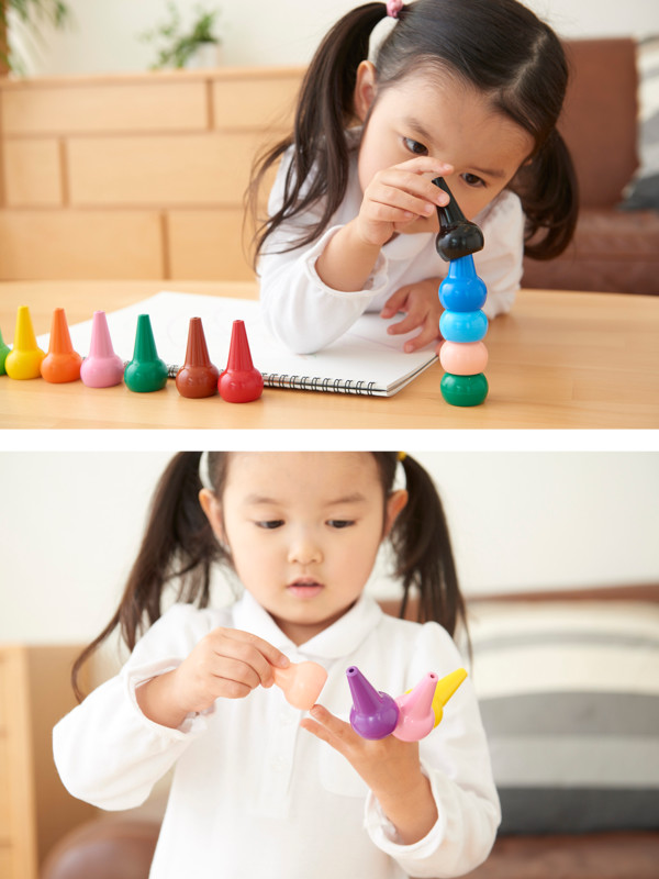 クレヨンの中が空洞になっているので、積み木遊びなど、色々な遊びをすることが出来ます。クレヨンやお絵描きに興味があまりないお子さまでも、転がしてみたり、倒してみたりと指先を使った遊びで楽しめます。このような遊びを通して色を覚えたり、色の組み合わせを楽しんだりと色に対する感性を高めることができます。