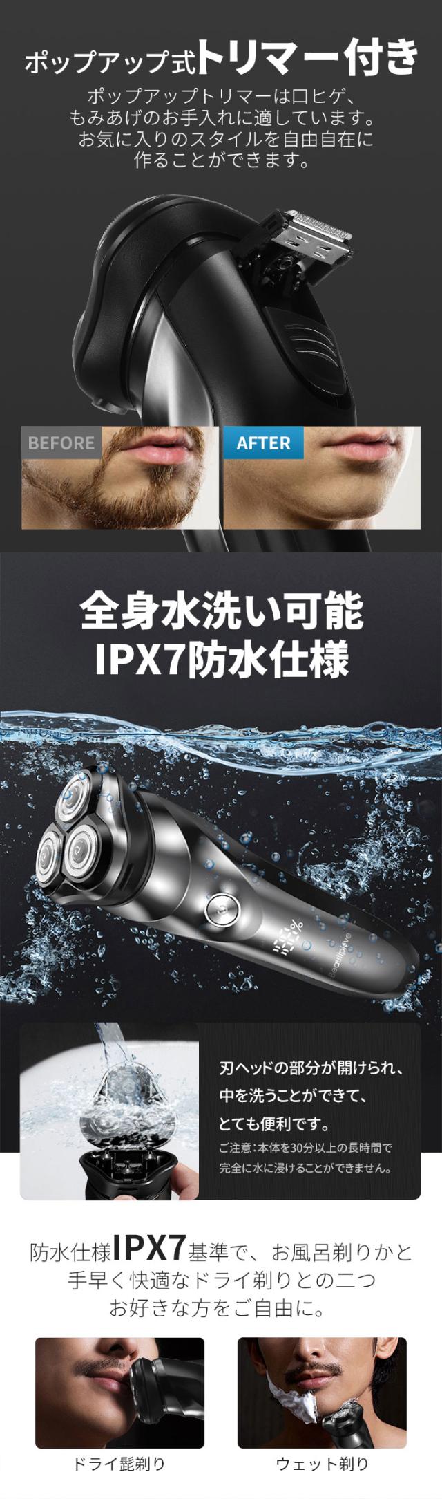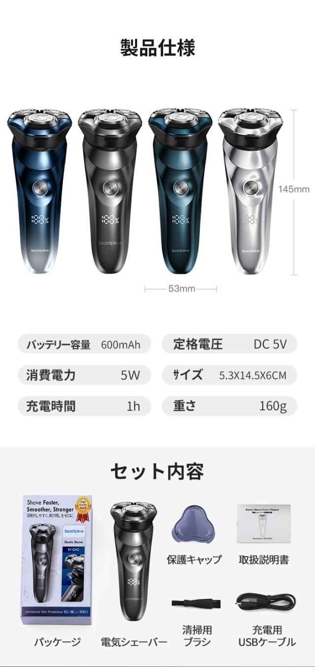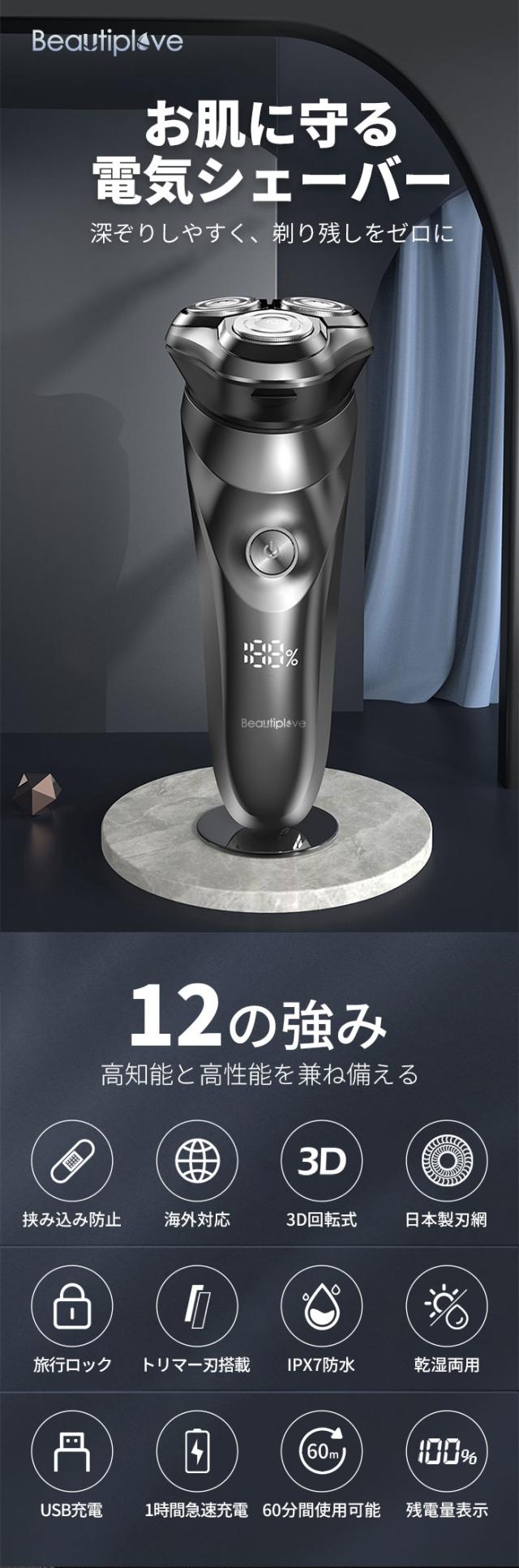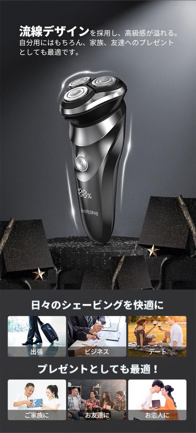 シェーバー 髭剃り 電気シェーバー メンズシェーバー 深剃り 60分間 電気髭剃り ひげそり 防水 丸洗い可 回転式 自動研磨 3枚刃 USB充電 1年保証