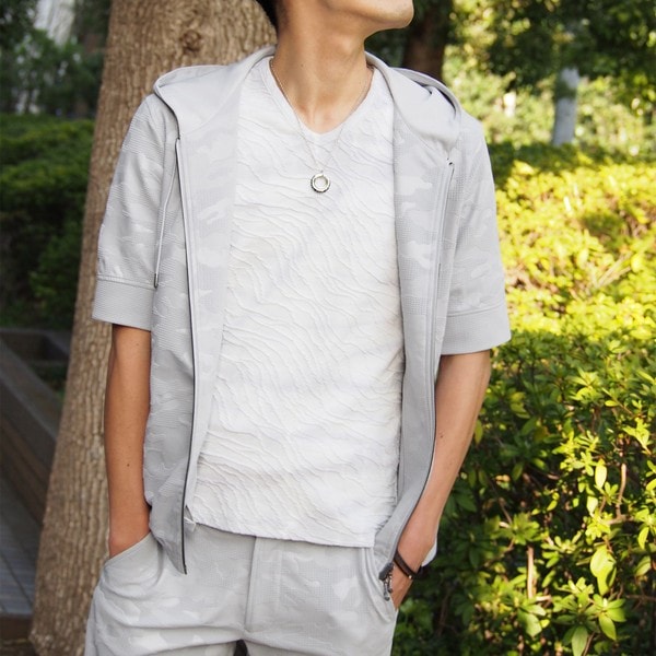 ストレッチ性のある地柄ブリスタージャカード生地にカモフラ柄をエンボス加工したオリジナル素材を使用しています。軽くて柔らかく、スポーツウエアの様な快適な着用感で、速乾性と防シワ性にも優れています。シルエットと着心地にこだわったパーカーで、普段着として、ワンマイルウエアとしてピッタリの1着となっております。