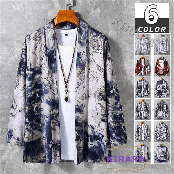 羽織 メンズ 柄物 和式 甚平風 カーディンガン 浴衣 着物 和服 トップス 開襟 和装コート 夏新作 総柄 七分袖 染め 薄手 サマー 夏祭り 大きいサイズ