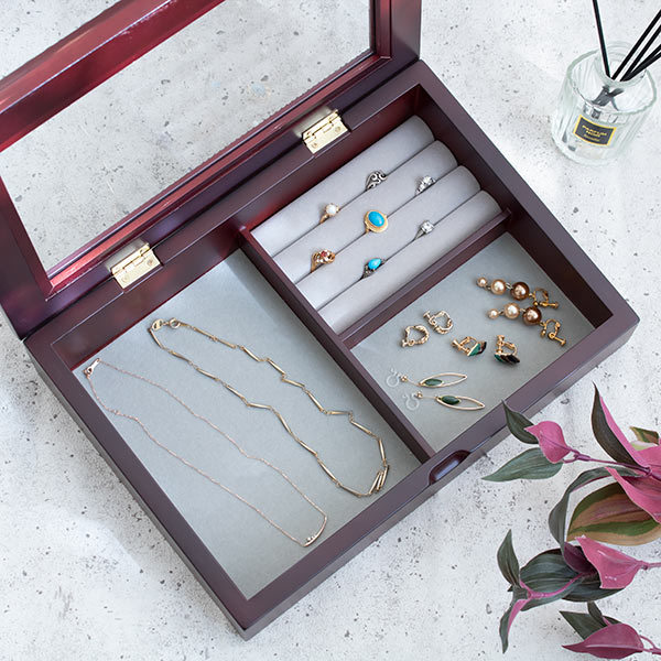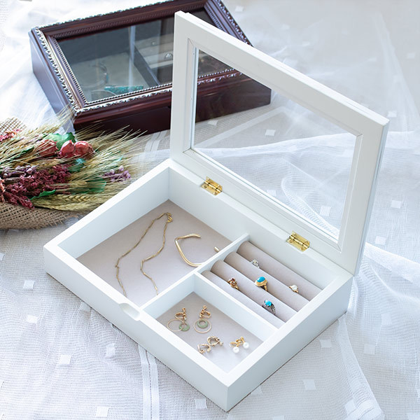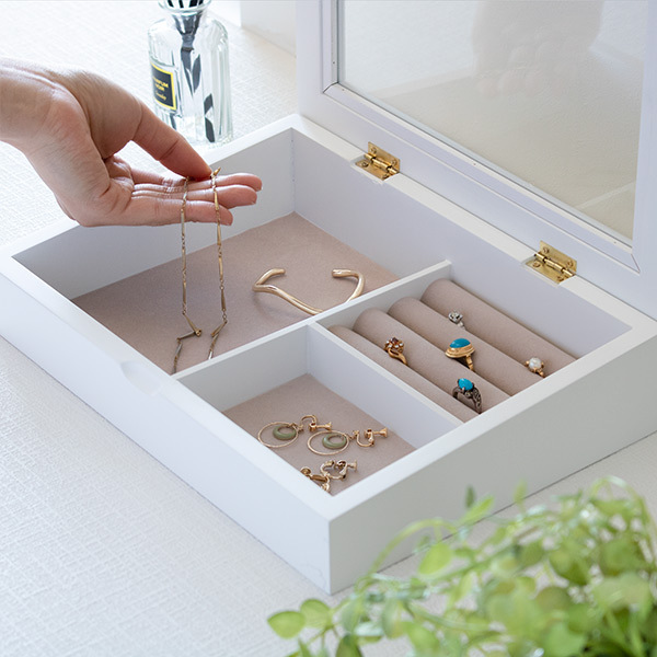 日常使いのアクセサリーをまとめるのにぴったりのコンパクトサイズです。ガラスの天板になっているので「見せる収納」としてもお使いいただけます。