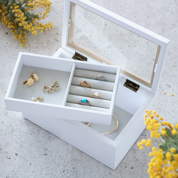 日常使いのアクセサリーをまとめるのにぴったりです。ガラスの天板になっているので「見せる収納」としてもお使いいただけます。