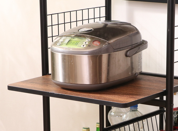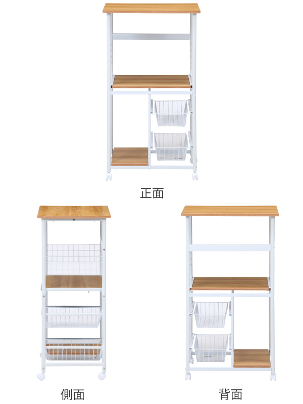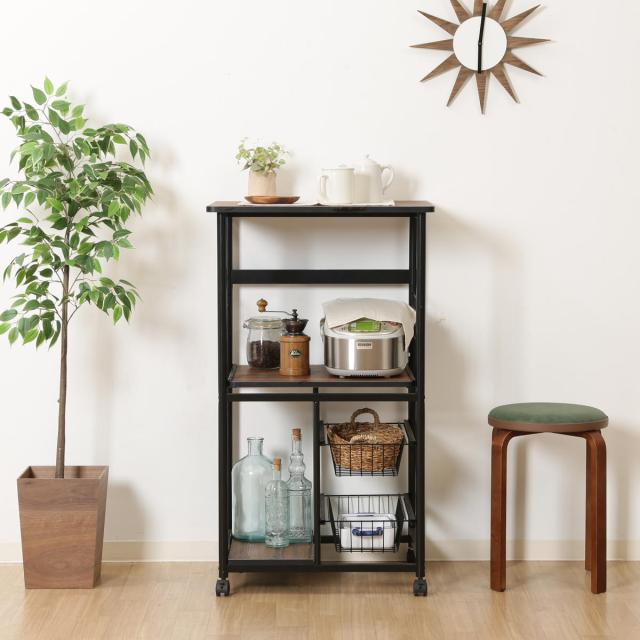 どんなお部屋にも合うシンプルなデザインのレンジワゴンです。多彩な収納スペースでキッチングッズをスッキリ収納できます。