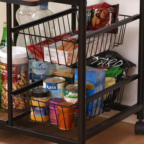 出し入れしやすいスライド式のバスケットが2段あり、食品やキッチン用品を見やすく収納できます。通気性に優れているので、根菜の保管にもおすすめです。