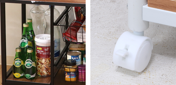 | 幅広く使えるオープン棚 オープン棚は、ペットボトルなど高さのある物の収納場所として最適です。 | キャスター付き 掃除や移動に便利なキャスター付きです。ストッパー付きなので、固定することができます。 |