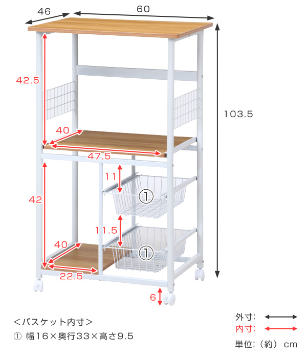 | 材質 | 天板・棚板:合成樹脂化粧パーティクルボード フレーム・バスケット:金属(鋼)、エポキシ樹脂塗装 |