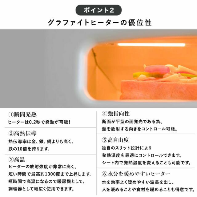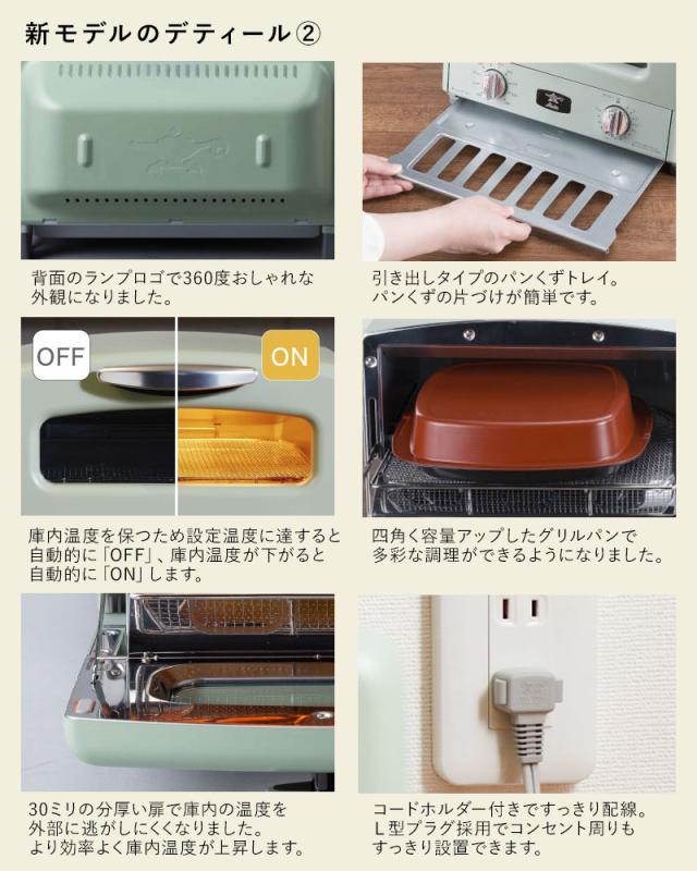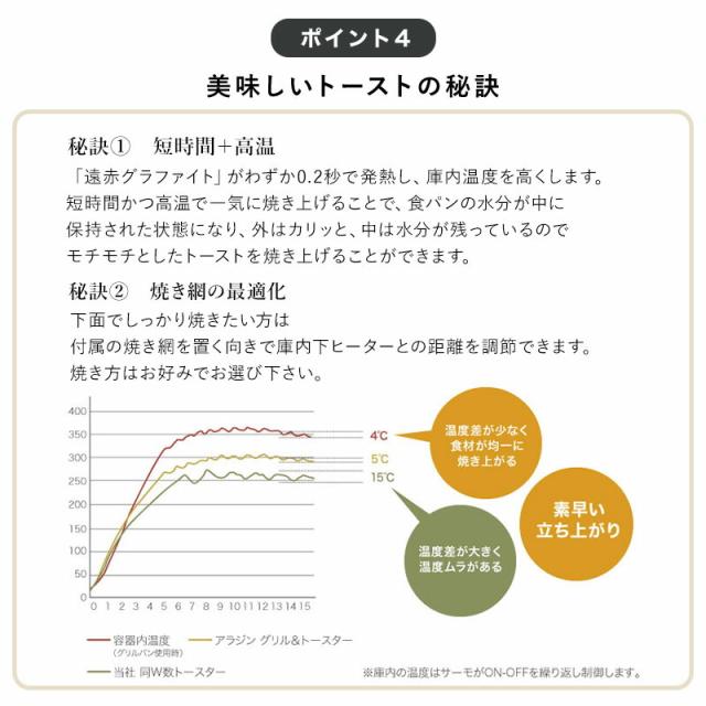 | 主な特徴 | ・アラジン電気ストーブにも採用しているグラファイトeヒーターをトースターに搭載。熱がムラなく広がり、トースターの庫内温度がより均一に ・焼き網を可動式にすることで手が届き難く、お手入れが難しかった扉周りのお手入れ性をUP! ・深鍋グリルパンに水を入れ、グリルプレートを敷いて加熱することで肉まんなどの蒸し料理が可能に ・焦げ付きにくい表面加工の採用でお手入れ性UP! ・高温になってもセラミック塗装は有毒物質を使用していないので安全安心 ・衣をつけた鶏肉をグリルプレートにのせて加熱すれば、ヘルシーな唐揚げに ・庫内下ヒーター3本でムラなく調理 ・ステンレス製でお手入れしやすい ・コードホルダーで配線スッキリ |