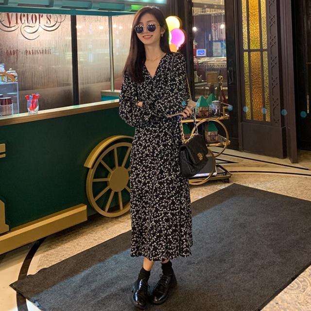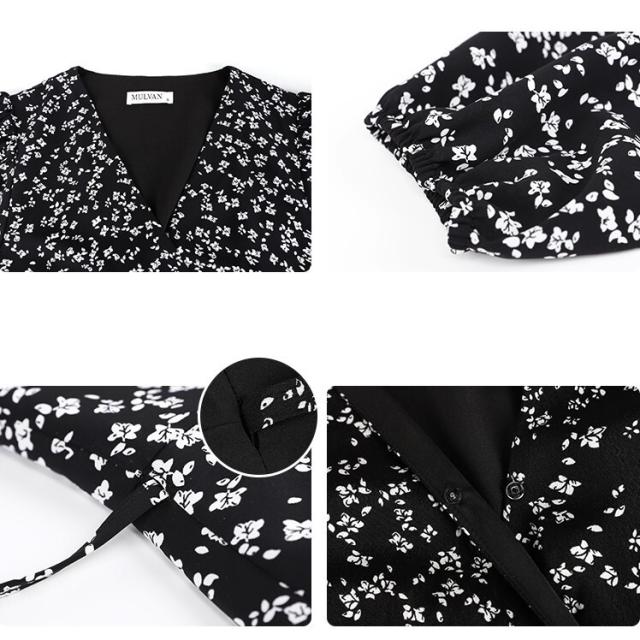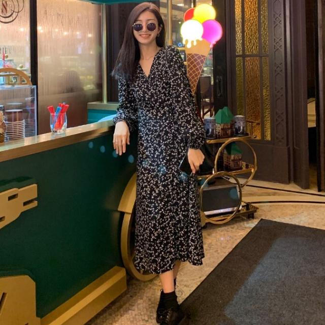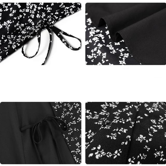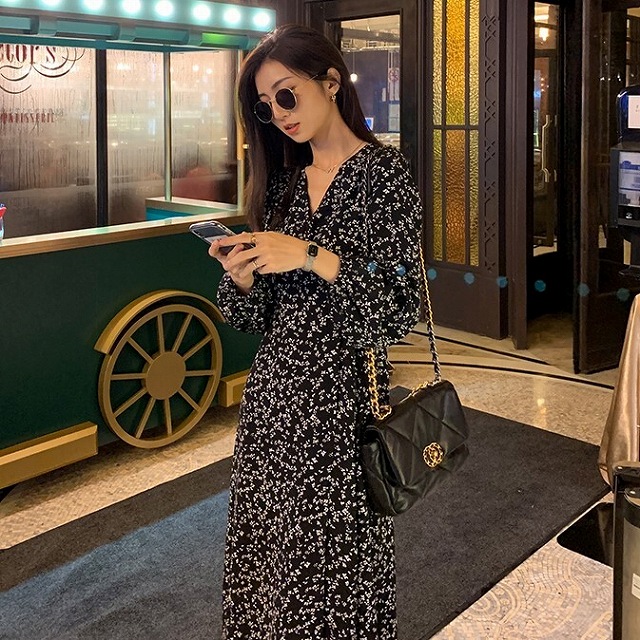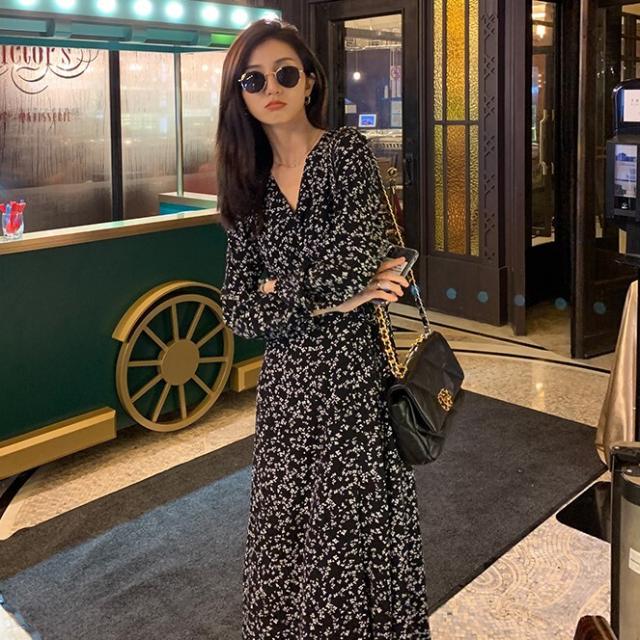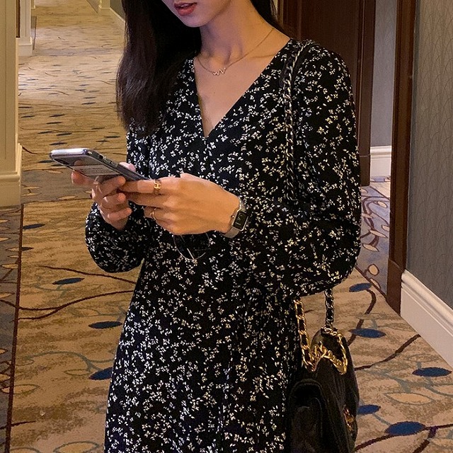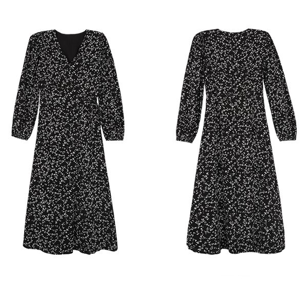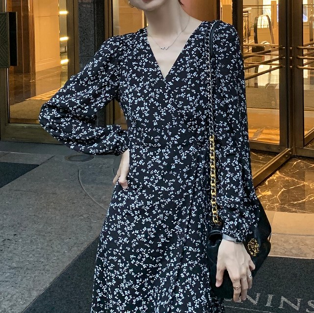 ワンピース レディース カジュアル ロング ミディ丈 春 夏 秋 カジュアル 小花 モノトーン 長袖 Aライン Vネック キレナチュ