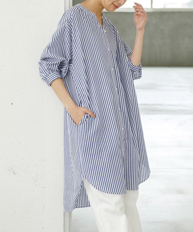 バンドカラー&スキッパー衿で抜け感を演出。前を開けてカーデ感覚で羽織ったり、前を閉じてチュニックワンピとして着たりと表情の変化も楽しめる1枚。