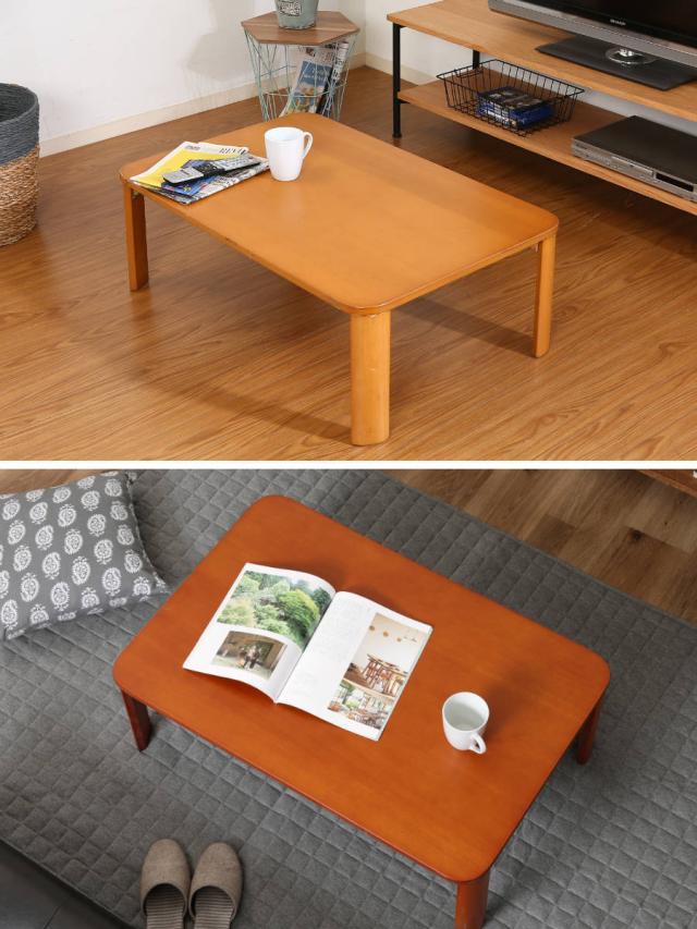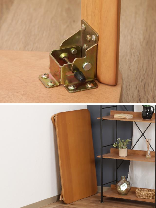 脚の根元に家具が付いており、ワンタッチで折りたたみができます。使わない時は隙間に収納できるので、来客用のテーブルとしても便利です。