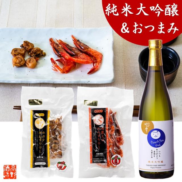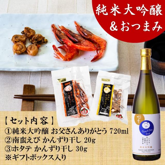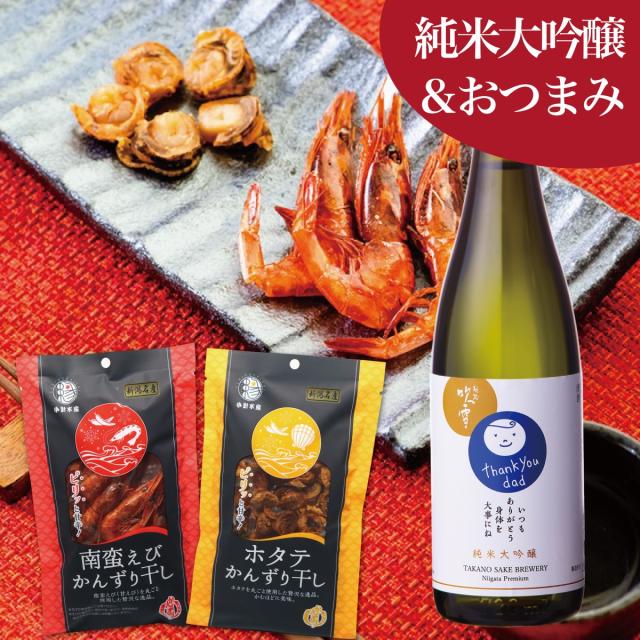 日本酒 おつまみセット 純米大吟醸 お父さん ありがとう 感謝ラベル 越路吹雪 720ml & 珍味 かんずり干し えび・ほたて セット 新潟 高野酒造 送料無料 父の日 敬老の日 60代 70代 80代 ギフト プレゼント 酒 お酒 甘口 贈り物 誕生日 のし可 父 祖父 孫