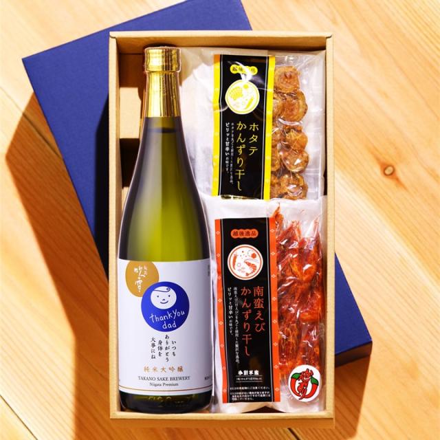 いつも家族のために頑張るお父さんへの日頃の感謝の気持ちをダイレクトに伝えられる「お父さんありがとう これからも元気でね」のメッセージ入り感謝ラベル純米大吟醸と、新潟名産のおつまみ「かんずり干し」の甘えび、ほたてが入った日本酒おつまみセットです。