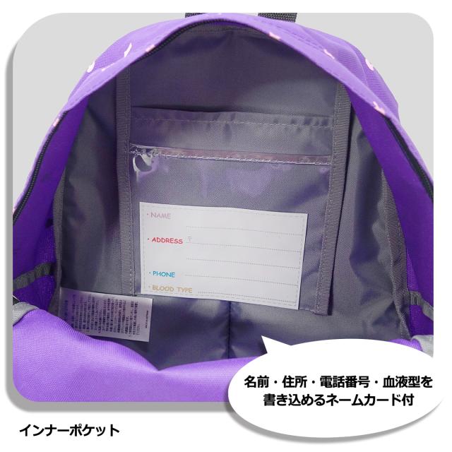 フロント、インナーポケット付で収納面も充実。反射テープ・住所や名前が記入できるネームカード付。