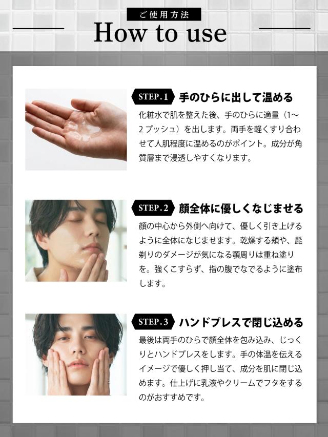 1日1〜2回を目安に洗顔後、適量を手にとりお肌に優しくなじませてください。