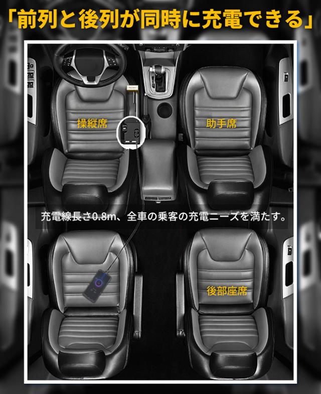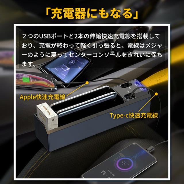 【USB充電+伸び縮み充電ケーブル】USBポートを2ポート搭載し、電子製品の急速充電が可能です。2本の伸び縮み充電ケーブルが付いています(1本のType-C快速充電線,1本のiphone快速充電線)、充電ケーブルは長さ0.8 m、伸縮可能で後部座席まで伸びることができ、全車の乗客の充電ニーズを満たす。