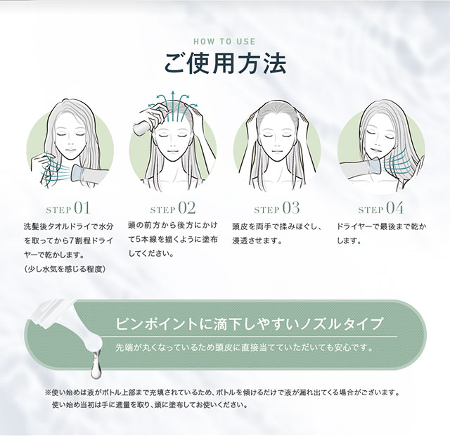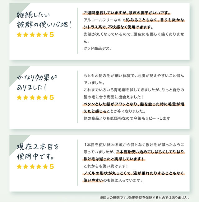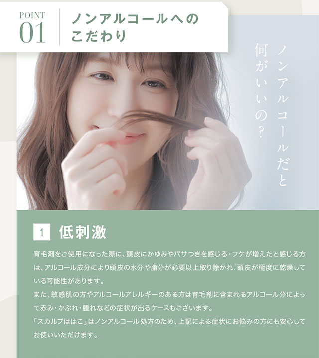 - 地肌が弱いために何を使ってもだめでしたがこの育毛剤はとても優しくノンアルコールで安心して使えています。 使ったあとスッキリします。 これからも使っても行きたいと思っています。