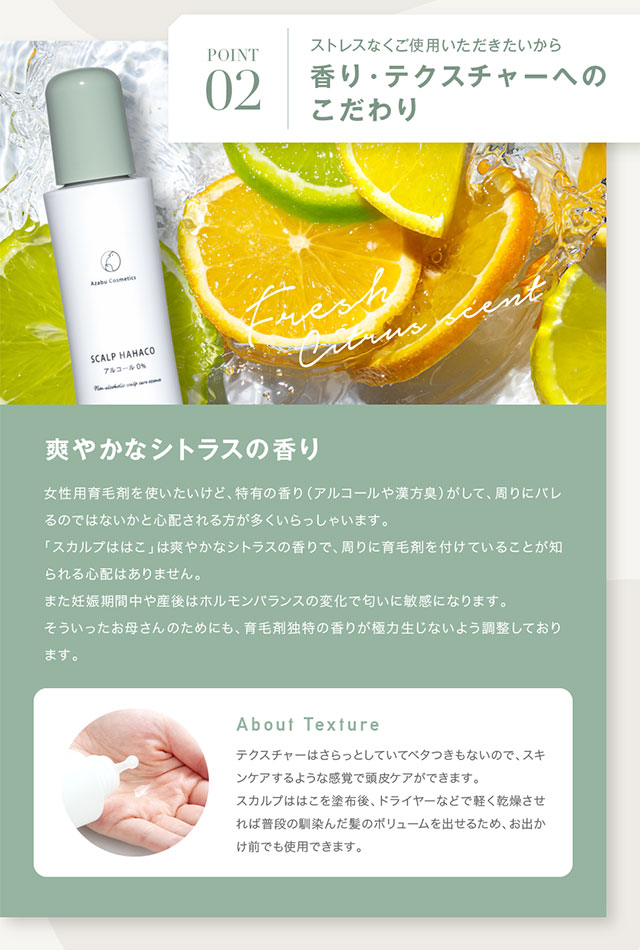・スカルプははこは爽やかなシトラスの香りにしております。使用しても周りの人に気づかれることはありません。