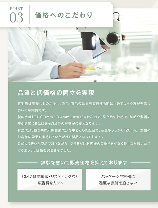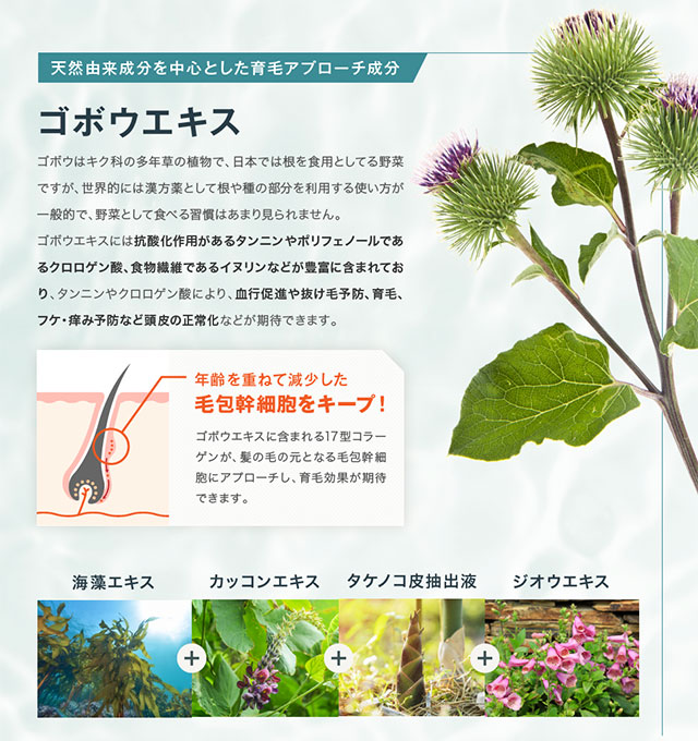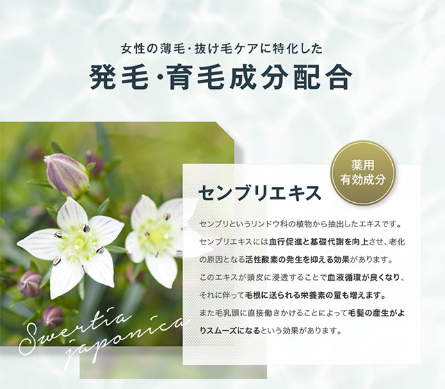 ・女性の薄毛・抜け毛ケアに特化した3つの薬用有効成分「センブリエキス」「グリチルリチン酸は甘草(カンゾウ)」「パンテノール」