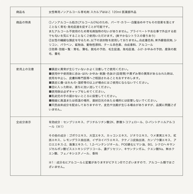 育毛剤 女性用 ノンアルコール スカルプははこ 120ml 発毛 育毛 ボリュームアップ アルコール0% アルコールフリー 低刺激 保湿成分配合 カラー、白髪染め、パーマ可 医薬部外品