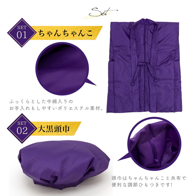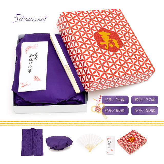 ちゃんちゃんこ 紫 古希 古希祝い セット 5点 大黒頭巾 末広 白扇子 栞 化粧箱 中綿入り 長寿 喜寿 傘寿 卒寿 パープル 敬老 送料無料【暑さ対策_b】